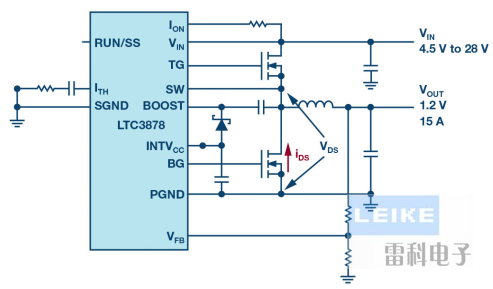 利用MOSFET RDS(ON)進(jìn)行電流檢測(cè),可以實(shí)現(xiàn)簡(jiǎn)單且經(jīng)濟(jì)高效的電流檢測(cè)。LTC3878是一款采用這種方法的器件。它使用恒定導(dǎo)通時(shí)間谷值模式電流檢測(cè)架構(gòu)。頂部開關(guān)導(dǎo)通固定的時(shí)間,此后底部開關(guān)導(dǎo)通,其RDS壓降用于檢測(cè)電流谷值或電流下限。